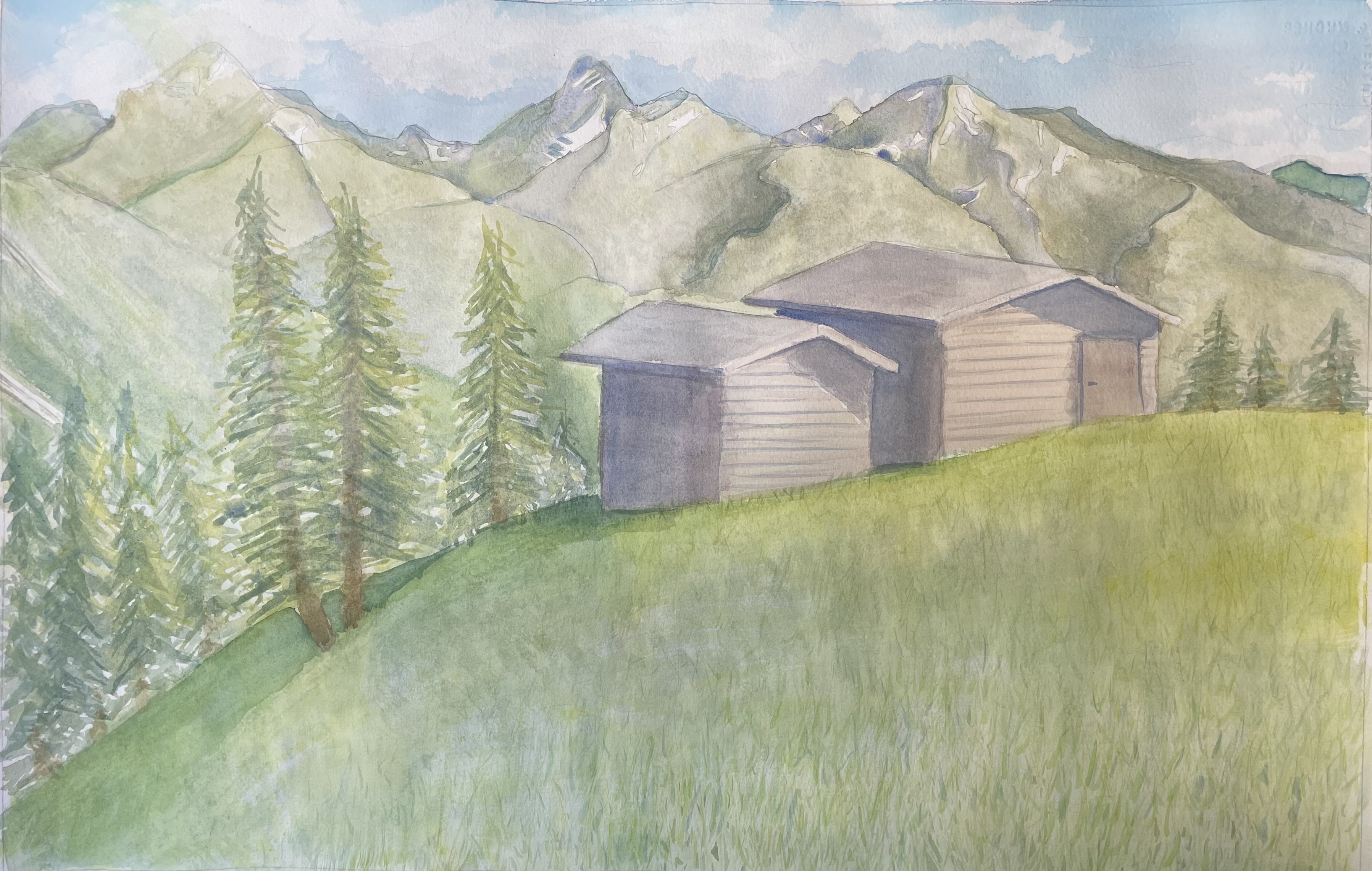 “Cabins in the Mountains” 2021, Watercolor on paper, 15inx23in